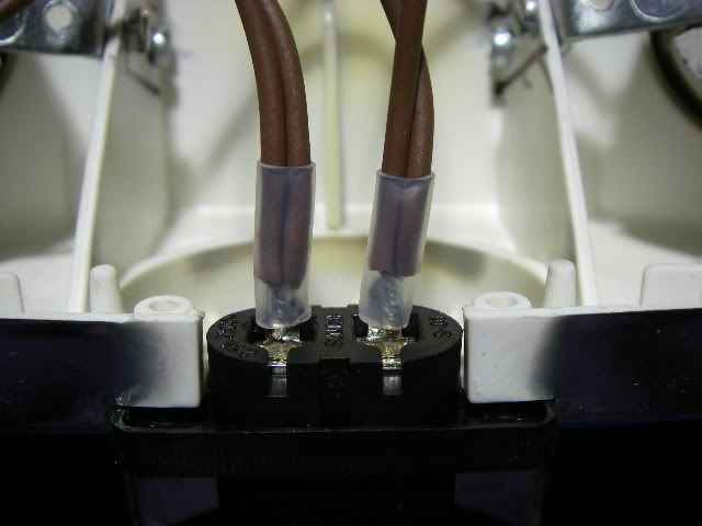 Once the holders are in place it's time to wire them. I used new cable stripped from a bit of flex. I made all the wires brown, since there's no point differentiating between live and neutral if the connector isn't polarised.
