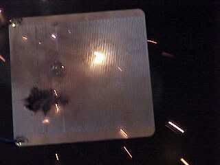 I didn't expect to get this picture, since I thought my timing with the camera would be way off. I set it to self timer mode and then counted the beeps to find out when to drop a steel Pachinko ball onto the PCB. As it transpired I did manage to catch the explosion right at it's commencement with the sparks flying off the PCB and a very visible burst of plasma errupting from the tracks. Note how the area that failed first has initiated a secondary failure where a metal laden spark has landed on another part of the PCB.