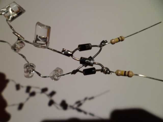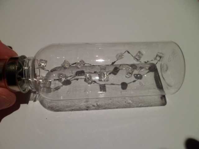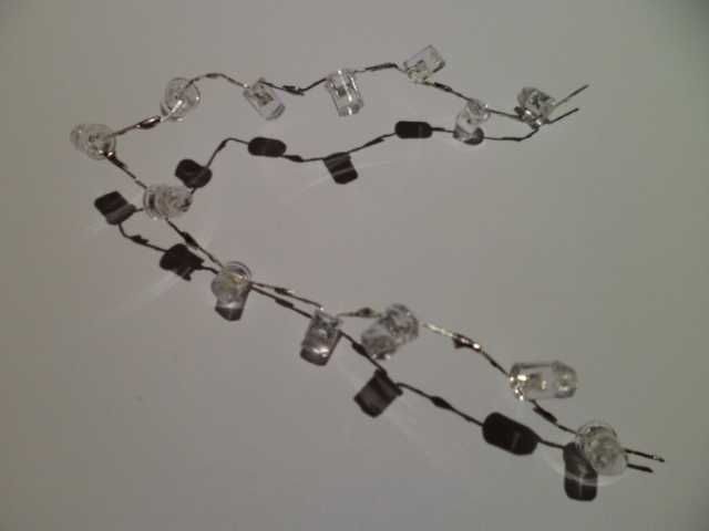 Now we make our string of LEDs. In the picture above I used a selection of warm and cold white LEDs with a few coloured ones thrown in. I've also "cracked the ice" of the LEDs (snipped the end of the lens off) to make their light output less directional.