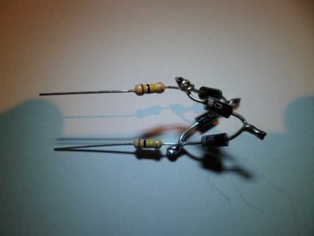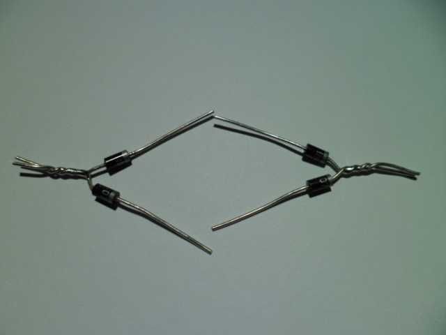 To make the rectifier start by getting four diodes and joining two by twisting the ends with the stripes together, then join the other two by twisting the end without the stripes together and solder as shown above.