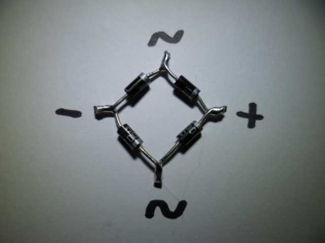 Now join and solder the two pairs as shown to create the bridge rectifier. The polarity will be as shown above with the two AC connections indicated by squiggles and the positive (+) and negative (-) connections that will connect to the string of LEDs.
