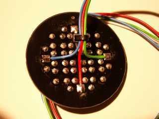Once all the LED pins are soldered you can add wires. I used pink for the common positive and red, green and blue wires for their respective colour. The pads are marked on the PCB as R, G, B and ++ in raised track under the black solder resist.