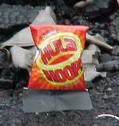 The charred Hula Hoops were actually picked up from around the vicinity of the explosion and put next to the blazing remains of the rig for effect, since there were none directly in the vicinity of the taste explosion.
