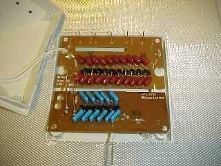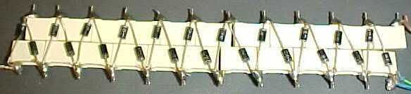 This is the mains end of a multiplier that I hard wired together using 30 220n capacitors. If you attempt to assemble your own multiplier in this manner, then be careful to tin all the connections with solder before assembling them since soldering four loose connections together can be quite awkward, even when the capacitors have been stuck together rigidly.