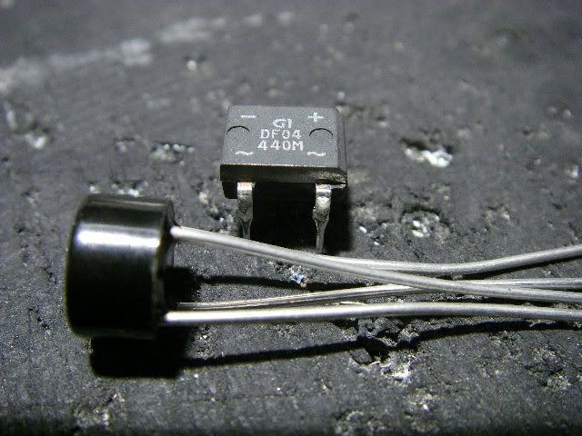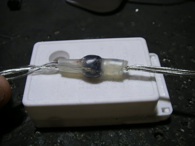 For a low voltage set (24V) I used a common 1 Amp 50V rectifier and again connected the output from the transformer to the AC pins and the lights to the DC pins, applied the heatshrink and filled the assembly with hot melt glue.