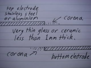I've shown two electrode arrangements, with yellow tape representing the bottom electrode and blue representing the top one. I'll mention again that there should not be excessive overlap, since any overlap will just pass AC current like a capacitor without producing any corona.
