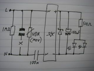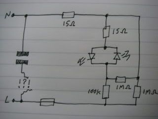 Here's the nonsensical schematic which shows 15-ohm resistors being used as links, a 1 Megohm resistor that could have slowly discharged the capacitor had it actually been connected, another 1 Megohm resistor doing virtually nothing, two ordinary 3mm LEDs in inverse parallel so they light on alternate polarities of the mains waveform, a 100K resistor to limit the current through the LEDs and a fuse in case something goes short circuit (it wouldn't have protected the MOV or capacitor!).