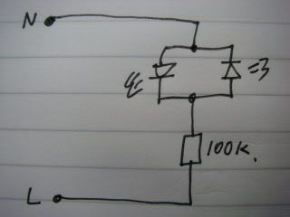 And here's the equivalent circuit of the plug once all the superfluous tat is removed. A quarter watt 100K resistor with two LEDs in inverse parallel across the mains. Although the resistor is rated at 0.25W it's actually being used at nearer 0.6W on the UK's 240V supply, so it gets a bit hot and smells all resistory when the plug has been "saving power" for a while.