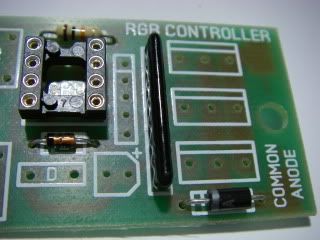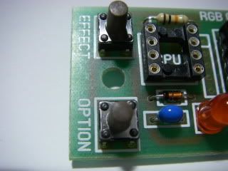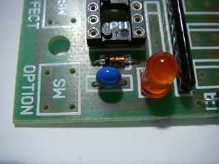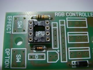 Next is the socket for the chip. It may vary in appearance from the one shown in the picture above, but will have the same function. There is an indent in one end of the socket which must match the indent shown on the PCB. This it to help ensure that the chip gets plugged in the right way round.