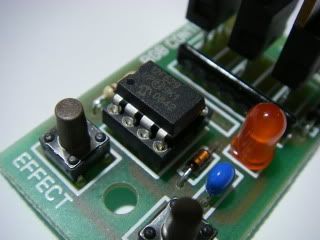 Now the chip is carefully inserted into it's socket, making sure that the pins don't bend as it gets pushed in. This chip is a PIC12F629 microcontroller preprogrammed to near full capacity with my own software.