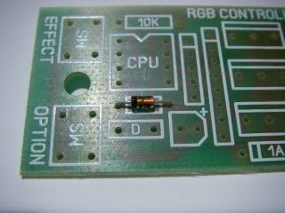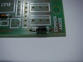 Now we install the polarity protection diode. This is a general purpose 1A rectifier diode and goes in the position marked 1A. Polarity of this component is important, so the band on one end must match the band on the PCB.