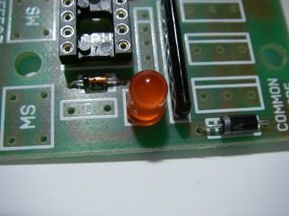 Another polarity sensitive component, the power indicator LED. The long lead goes to the end of the PCB marking with a small "+" symbol.