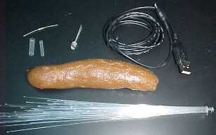 You will require one large fake poo (don't use a real one), a small fibre optic loom like those found on kiddies flashing wands, a couple of bits of heatshrink sleeving, a resistor, an LED and a cheap USB phone charging lead. The lead I used was for charging a Nokia, but was got purely for it's availability. If you use a standard USB lead, then you can get power from the thicker wires, but must ensure that the two data cores are insulated to protect from damage.