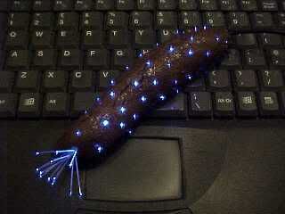 The fake poo is carved out with a Dremmel to accomodate the fibre optic loom and the electronics. A small hole is drilled in the end to allow the cable to enter, and the poo is peppered with small holes to accomodate the fibres.