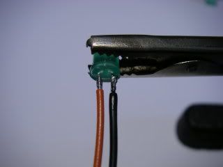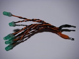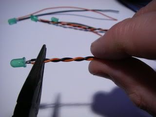 The wires are cut into equal lengths of about 6" (150mm) and soldered to the LEDs taking care to match the LED polarity.