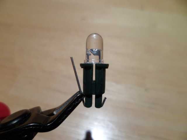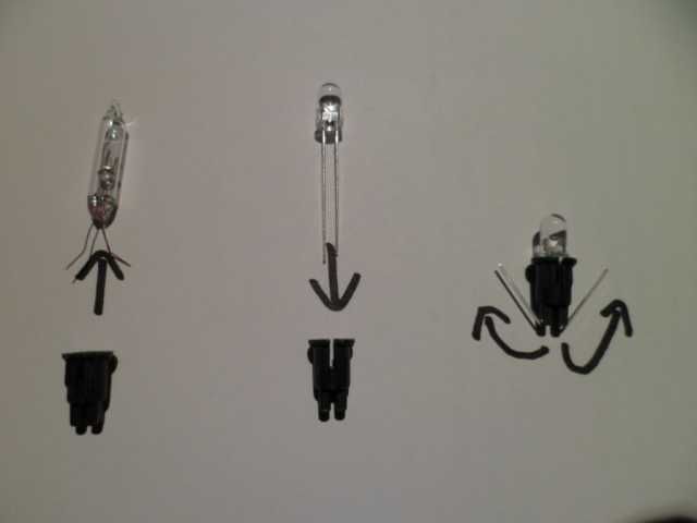 Now we start to swap the tungsten lamps for the LEDs, starting with just one. Remove the original tungsten lamp from its holder as shown and drop your choice of LED in its place. I strongly recommend the high brightness types for best effect. Push the LED fully against the front of the holder and fold the leads back along the side as shown above.