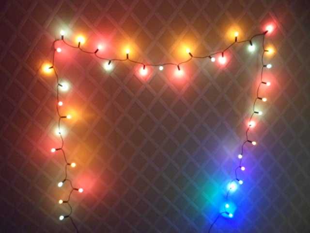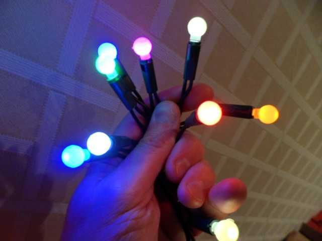 This is what we're aiming for. A bright string of changeable LEDs that can be modified and customised to your hearts content. My camera has been quite generous with the intensity in this picture. The LEDs are deliberately run at low intensity to give them a gentle tungsten-like glow and keep the in-line power supply as simple as possible.
