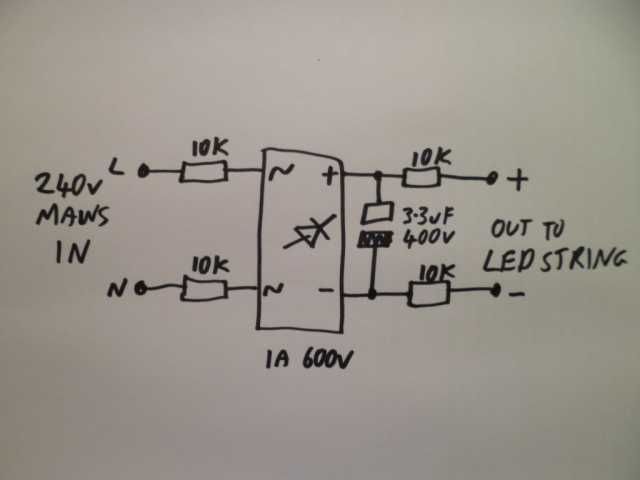 For a 230V mains supply it's best to use a minimum of 40 LEDs which will typically drop around 2.5V each giving a total of about 120V. This leaves 110V to drop across the resistors. I used four 10K ohm (ten thousand ohm) quarter watt resistors giving a total of 40,000 ohms. That gives a theoretical current of around 3mA which means that means that just 0.33 Watts is being dissipated from the resistors, or less than a tenth of a watt from each.