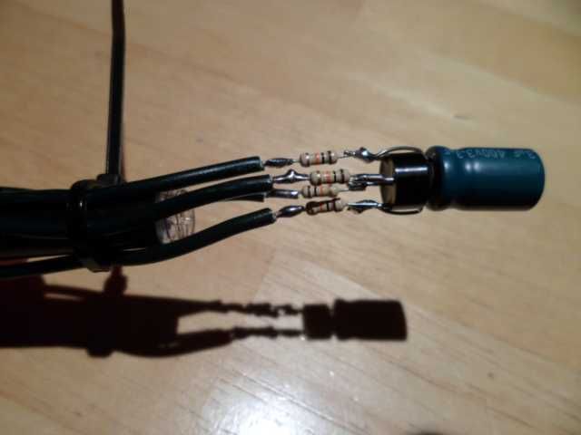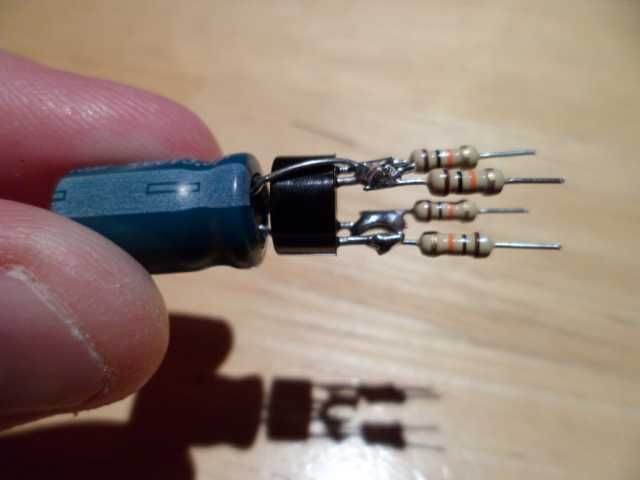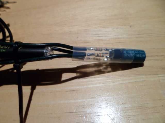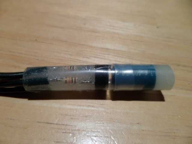 In this picture I used a bit of heatshrink sleeving to act as a potting tube, and ended up using two bits since I didn't have one long enough to cover both the (unnecessary) capacitor and the rest of the assembly. Ideally you would find a long thin plastic sleeve or container with a closed end so that there was plenty of room to pot the circuit deeply in resin.