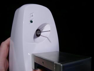 Here's the candidate for modification. It's an Air Wick Fresh-Matic unit which has a motorised assembly that pushes the aerosol cans plunger down to release a measured dose of stinky stuff on a regular basis.