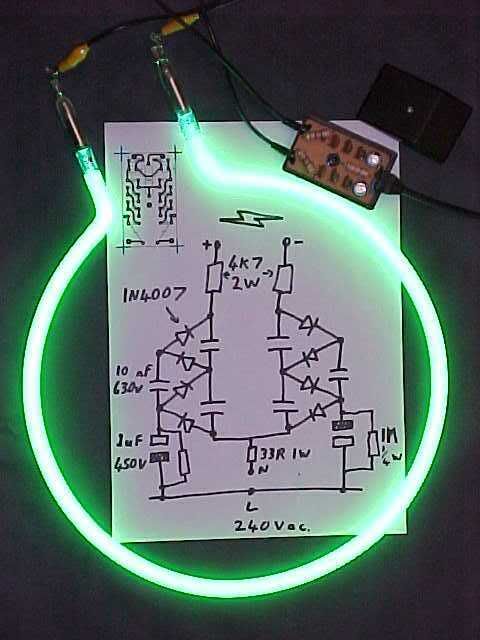 Initially a new tube may shimmer and stay dim or repeatedly strike and extinguish until it has adjusted to being run on a DC supply, but after it has been lit for a while it will happily light up instantly in future. The circuit drives the tube at around 15mA with only the cathode heating up. It uses about 4 watts of power which is peanuts given how bright the tube looks, and this also means that it can be left on continually without guilt. Because of the low mains current requirement the circuit can be switched with nothing more than a triac opto isolator if a touch of animation is required.