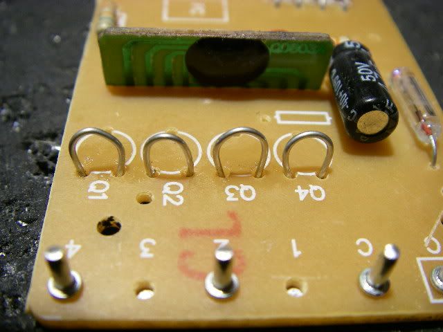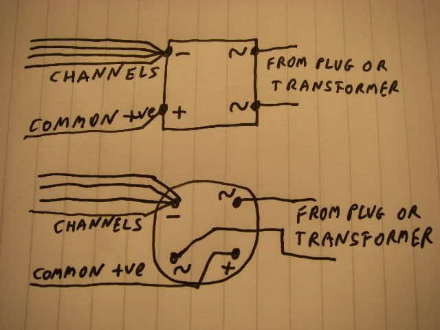 If the connections on the controller are not marked as shown on the righthand controller above, then you'll need to work out the connections by tracing the tracks on the PCB. The power-in connections from the plug or transformer will usually be next to each other and will usually head straight to the four diode rectifier on the PCB. The output channels should be obvious because the tracks will go straight to the little thyristors. The common positive for the lights will often be at the opposite side from the two power connections, but not always. If you can work out what the power connections (from the plug or transformer) are and then deduce the outputs then the only remaining connection should be the common positive for the lights.