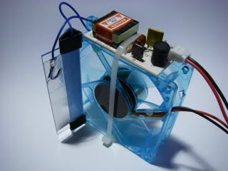 And here's the finished unit. It uses a standard 12V case fan to push air across the corona and mix the resulting ozone into the rooms air. The corona plate is attached to the fan with two bits of binding strip normally used to hold documents together. I put a blank glass plate in it to align the two bits, then glued them to the fan with resin. (Cheers to Adam Aglionby for the mounting suggestion.) A proper mounting clip would have been nice, particularly one that also made the connections onto the plate.