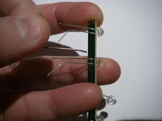 Now you can get all ambidextrous like I do, or use an improvised jig (or some tape) to hold the LEDs in place while you solder them. I prefer to solder one lead first (usually the positive one) then check they're all aligned correctly before soldering the other.