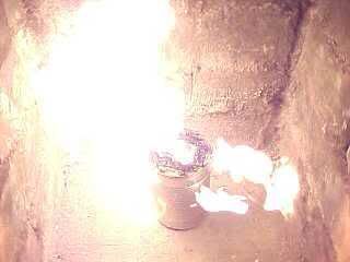 This effect can be enhanced by building it into a suitable prop. I tend to use the cheap cast aluminium post-top garden lanterns which with the top and lampholder removed, make an ornate receptacle for the fuel can. The glass panels should be removed and replaced with sections of metal plate that stop just short of the bottom of the light to allow air to enter at the base.